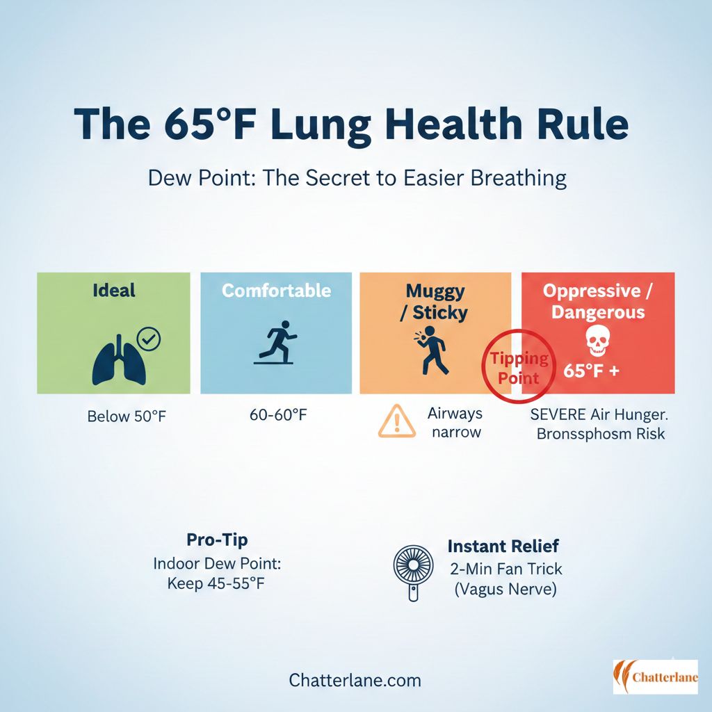 While most weather apps emphasize the humidity percentage, the Dew Point is the only metric that truly dictates respiratory comfort. For those living with asthma, COPD, or chronic “Air Hunger,” the number 65°F (18°C) represents a critical biological tipping point. At this precise level, the physics of the air changes, transitioning from merely “sticky” to physically Oppressive.